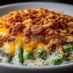 This casserole nails three things: ease, flavor, and crowd appeal. Canned green beans and canned soups keep prep time minimal; sharp cheddar and fried onions add bold, familiar flavors that kids and adults enjoy; and baking melts everything into a bubbly, golden finish that reads “special occasion” even when it’s not. It’s also budget-friendly and pantry-stable — perfect for last-minute gatherings.
