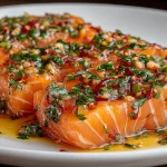 I still remember the first time I made this raw salmon—simple slices brightened by lemon and a sprinkle of dill—and how it turned a rushed weeknight into something that felt deliberate and elegant. This is a minimalist raw salmon preparation: thinly sliced fresh salmon dressed with citrus, good olive oil, a pinch of sea salt, and fresh herbs. It’s a refreshing appetizer or light starter that showcases the fish’s texture and flavor without fuss.