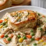 - Bake the biscuits and serve spooned over the creamy chicken-vegetable filling.