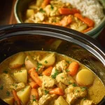 This recipe is a great weeknight hero: low-effort, crowd-pleasing, and deliciously forgiving. Using chicken thighs keeps the meat juicy after hours in the slow cooker, while the coconut milk and curry powder create a rich, aromatic sauce that’s both warming and slightly exotic. It’s budget-friendly (few ingredients), family-friendly (mild curry — adjust to taste), and easy to scale when you’re feeding a crowd.