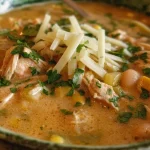 Before you jump in, here’s a short roadmap so you know what to expect: sauté the diced onion until translucent, add garlic briefly, then pour in chicken broth, diced green chiles, and the spices to simmer for about 15 minutes. Mash a cup of the cannellini beans with a little broth to thicken the base if you like, then stir in cubed Neufchâtel (or cream cheese), corn, both mashed and whole beans, and finally the shredded chicken. Finish with lime juice and cilantro and heat through — total active time is short, and most of it is gentle simmering.